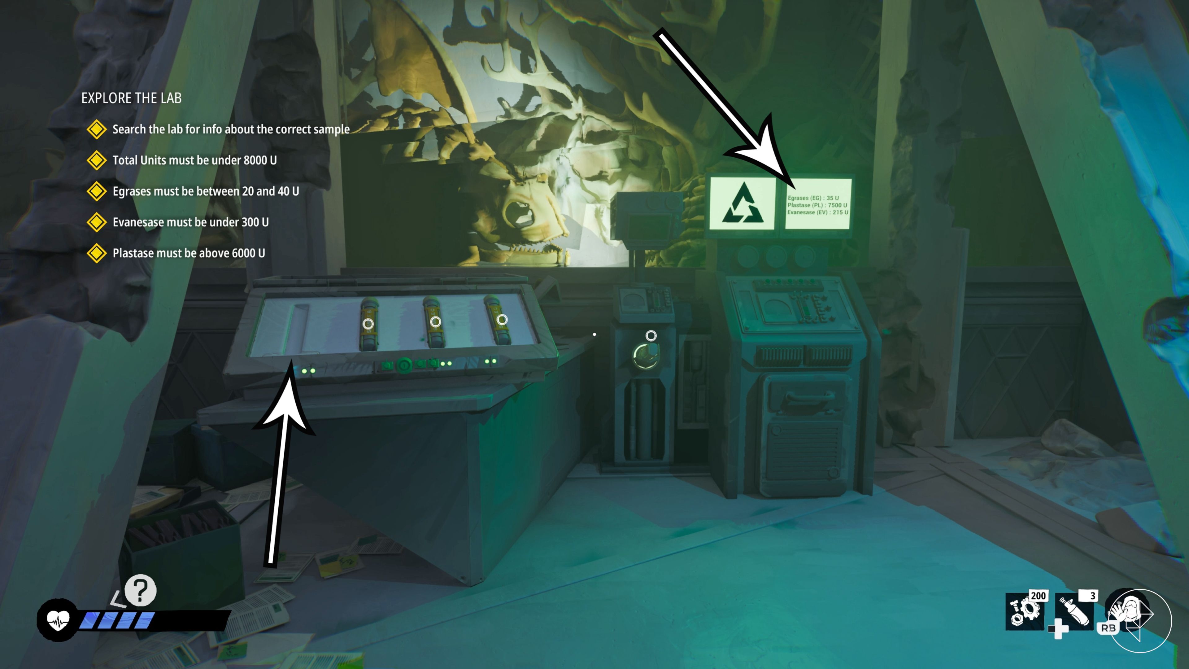 使用钥匙解锁样本装置(Nahe 和 Eyla 正在那里等你),并与 Nahe 对话。看到盒子里的四个样本了吗?你需要找出哪一个是正确的。你可以直接跳转到下方的答案,或者通过阅读房间里散落在各张桌子上的文件来收集全部四条线索。