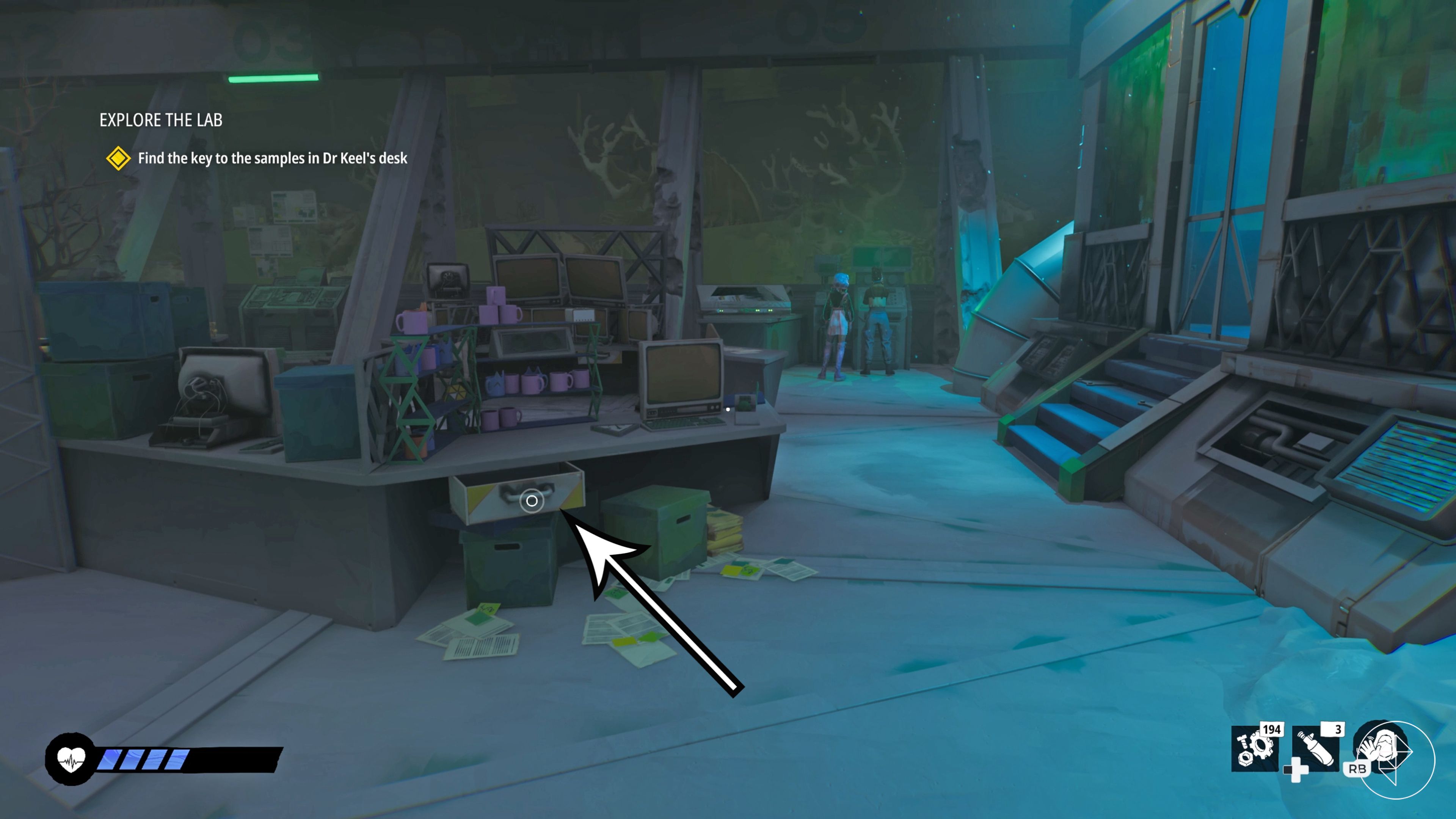 现在,你必须在凯尔博士(Dr. Keel)的桌子上找到样本钥匙。这张桌子位于样本装置对面,靠近锁着的门口。打开抽屉即可找到钥匙。
