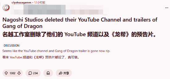 而据Destructoid报道,《如龙》Reddit相关板块的玩家发帖表示,名越工作室在毫无预警的情况下清空了其YouTube频道,删除了所有与工作室及《Gang of Dragon》相关的内容。目前在YouTube上,想要观看该作预告片,唯一“官方”渠道只剩下TGA的账号。
