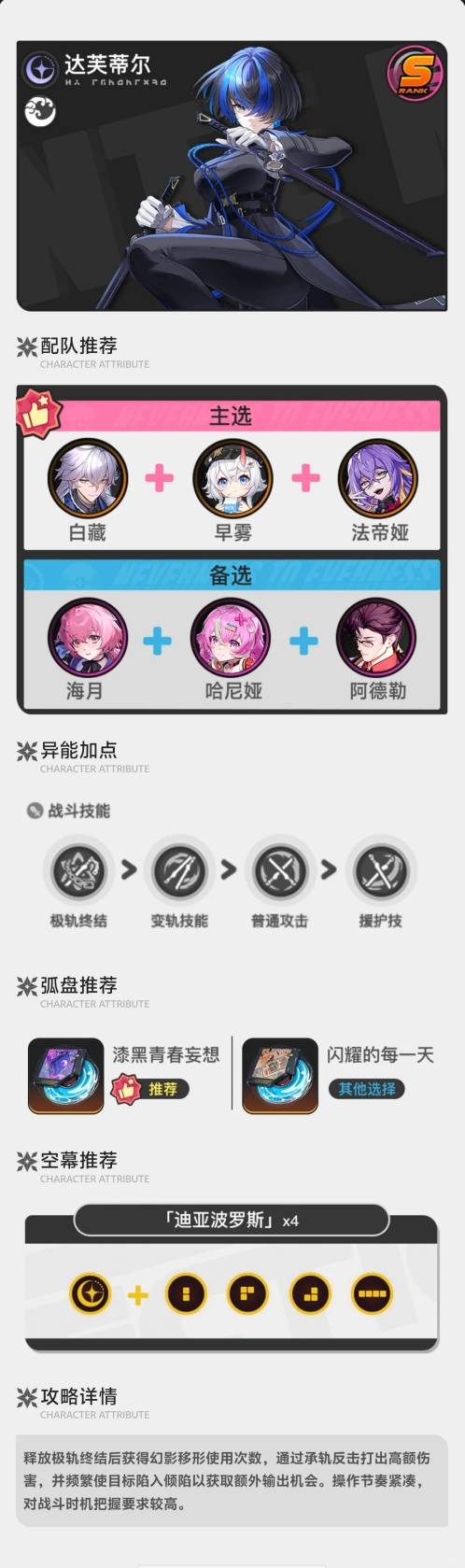 异环培养古董店期:《异环》中的达芙蒂尔隶属于伊波恩古董店阵营,定位为输出型角色。小编针对该角色的培养框架进行了整理,内容涵盖武器与圣遗物类装备的选取建议,以及适配的队友组合方案。下文将该角色的养成要点以图文形式进行汇总,帮助玩家养成开荒。