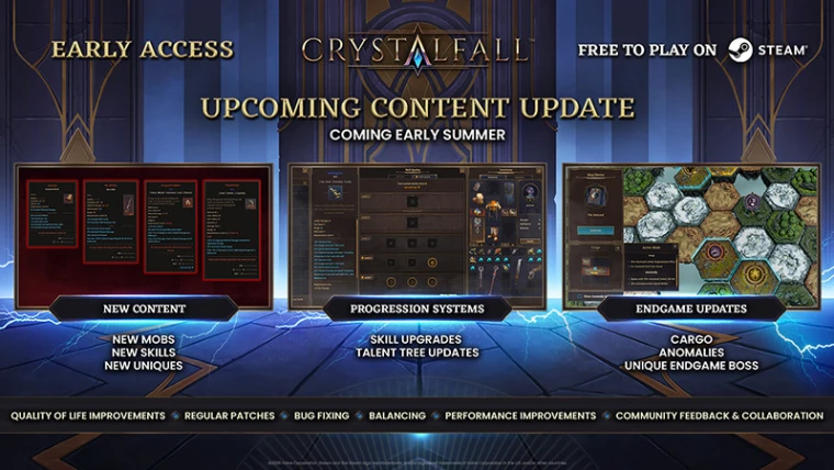 CRG Studio近日对外公布了旗下免费动作角色扮演游戏《Crystalfall》的后续开发路线图。该作于4月10日在Steam平台以抢先体验形式上线,定位为暗黑风格的刷装类玩法。根据此次释出的规划,开发团队将在未来数月内陆续推出多项内容更新,涵盖新区域、职业调整及赛季机制等。
