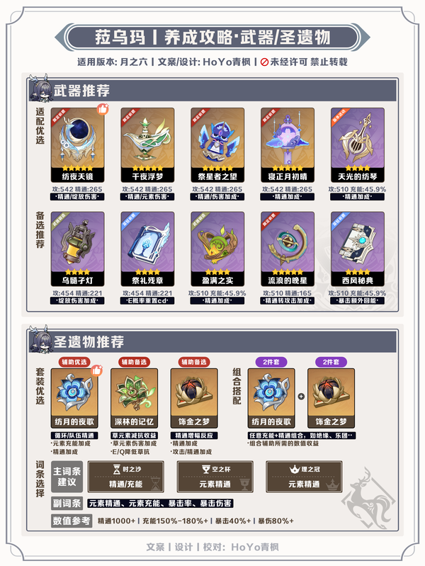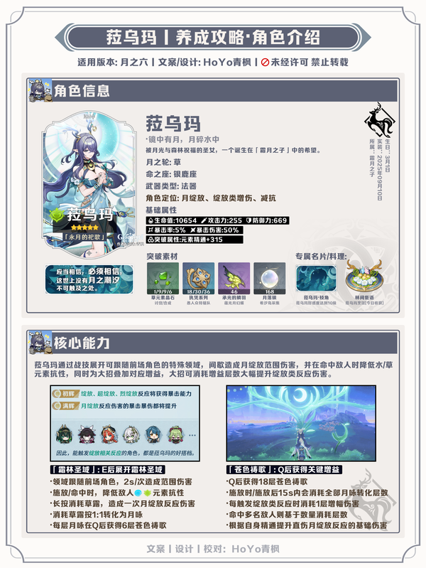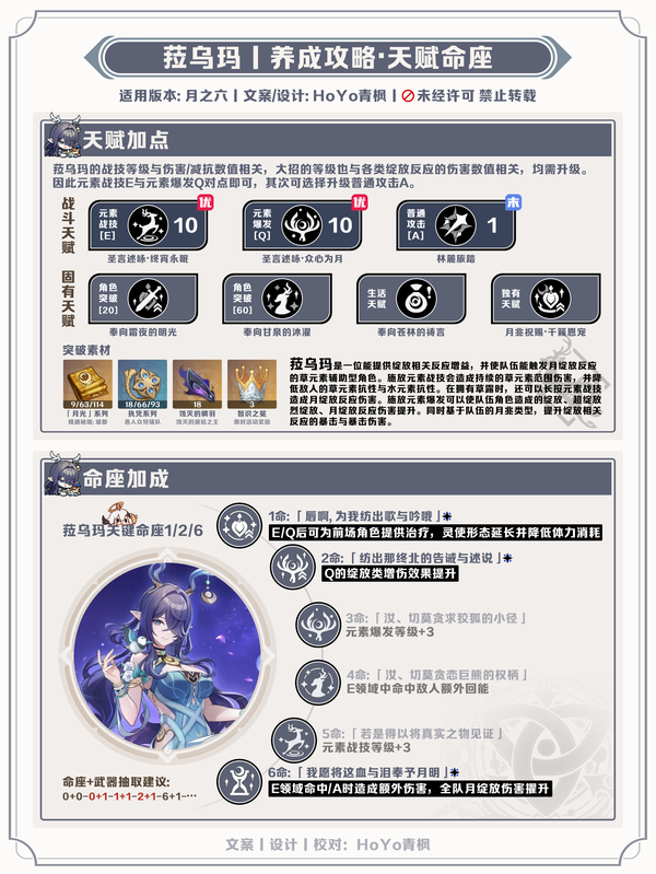 霜月之子上线!五星角色菈乌玛定位为水系法器绽放辅助,同时也是希莉亚体系的重要插件。这边以图解形式整理了该角色的养成参考,内容涵盖武器选择、圣遗物搭配、天赋升级优先级及适配队伍组合方案,供有意抽取的玩家在培养规划时对照使用。